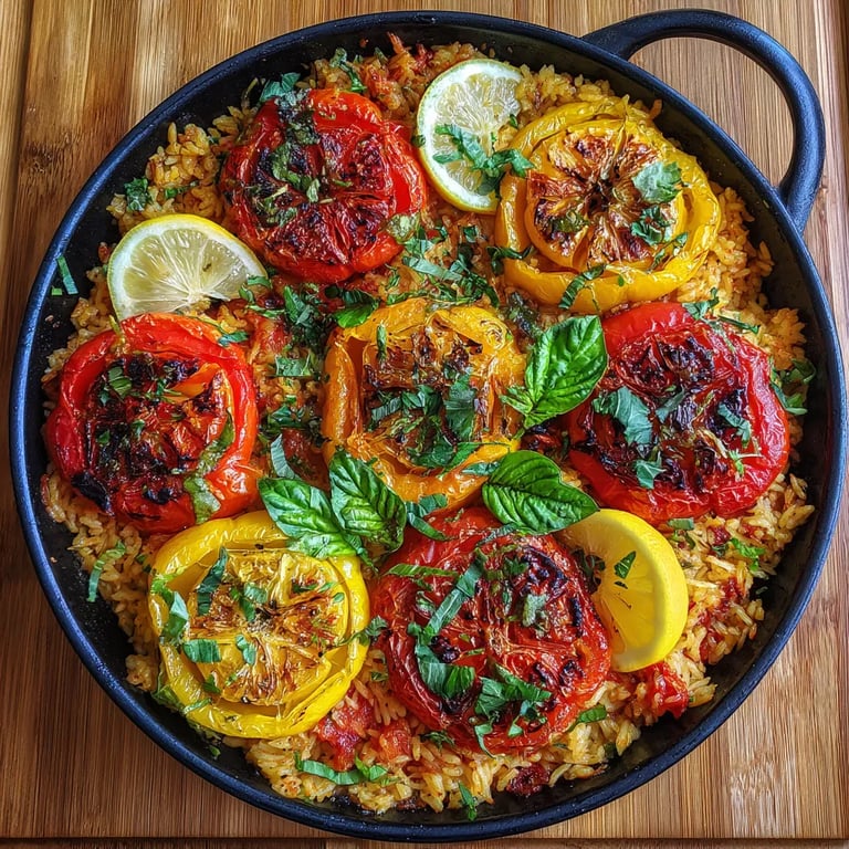 Guardar Este arroz con tomate y pimientos asados es mi plato favorito cuando necesito algo reconfortante pero ligero. La combinación de tomates jugosos y pimientos dulces asados transforma un simple arroz en una comida memorable que funciona tanto como guarnición elegante como plato principal ligero.
