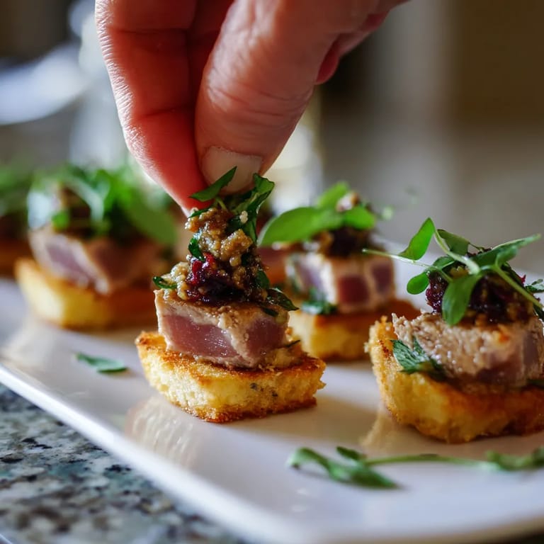 - Sobre cada pan caliente coloca cuidadosamente un par de cubos de atún sellado. Agrega una generosa cucharada de tapenade encima y termina con perejil fresco picado para dar un estallido de color y aroma.