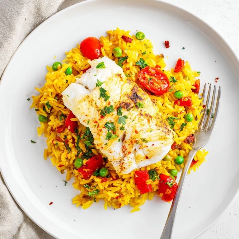 Guardar Un plato vibrante y aromático preparado en una sola sartén que presenta filetes de bacalao tiernos sobre arroz dorado con azafrán, tomates y guisantes. Ideal para una cena mediterránea deliciosa y reconfortante entre semana.