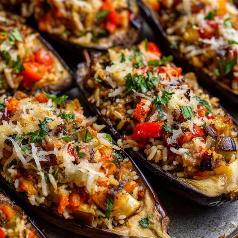 Guardar Estas berenjenas rellenas vegetarianas han sido mi forma favorita de aprovechar la temporada de agosto y septiembre desde que probé la receta de mi abuela en un viaje a Valencia. El relleno de verduras dulces y arroz hace de cada mitad de berenjena un plato reconfortante y muy sabroso ideal para cenas ligeras y saludables.