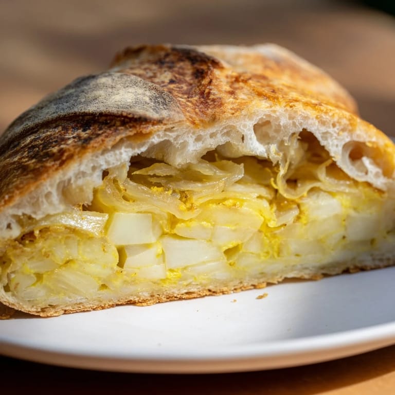 Guardar Un bocadillo de tortilla es un clásico español donde una generosa porción de tortilla de patatas y cebolla se sirve en pan crujiente—simple delicioso y perfecto para cualquier momento.