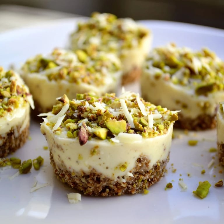 Mini bocados cremosos con una base crujiente de pistacho y un relleno suave y aromático.