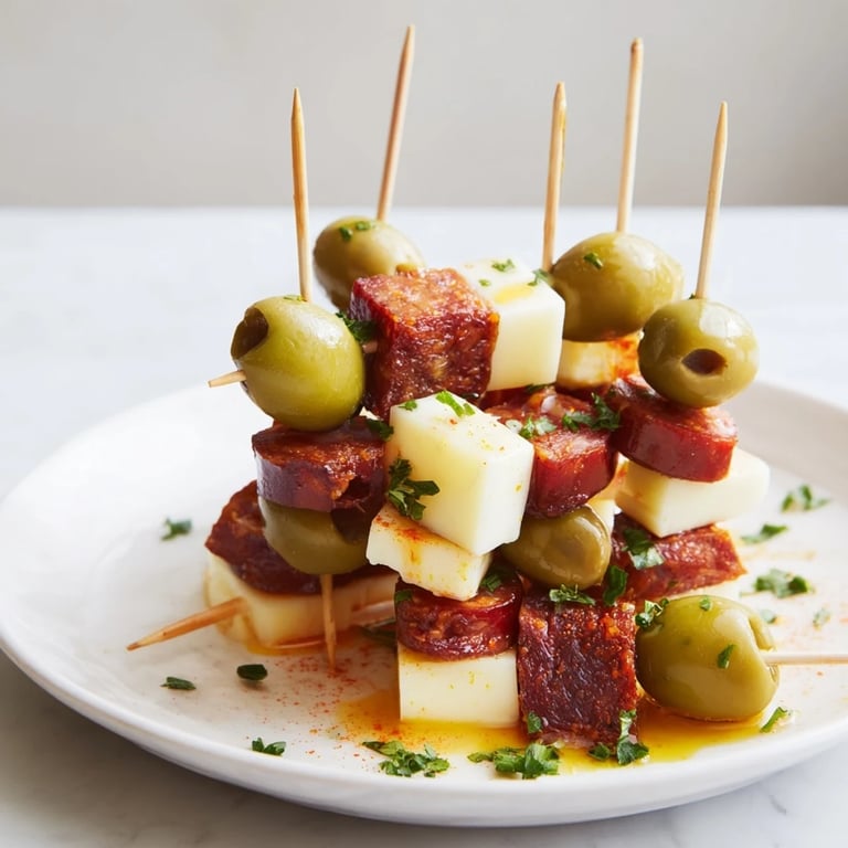 Guardar Estas brochetas de aceitunas y queso Manchego son un aperitivo vibrante que captura la esencia de los sabores españoles: aceitunas saladas, queso Manchego con notas de nuez y el toque ahumado del chorizo. Son perfectas para fiestas, reuniones o veladas de tapas.