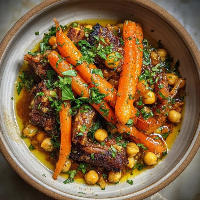 Guardar Este guiso de cerdo con garbanzos y zanahorias es mi salvación durante los meses fríos, ofreciendo calidez y confort en cada cucharada. La combinación de cerdo tierno, garbanzos terrosos y zanahorias dulces crea un plato reconfortante que mejora con el tiempo.