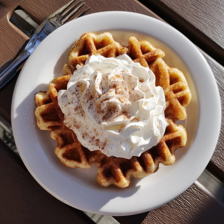 Guardar Disfrutar de waffles churro recién hechos con un toque cítrico ha transformado mis desayunos especiales y reuniones familiares. Esta receta logra el equilibrio perfecto entre la textura crujiente del churro, el cálido sabor a canela y una crema montada con naranja que aporta frescura y ligereza. Ideal para una mañana de domingo o como postre que deja a todos sonriendo.