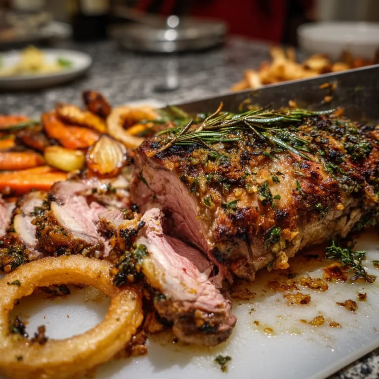 Guardar Este cordero lechal asado con romero y tomillo es una delicia aromática perfecta para celebraciones especiales o para elevar una cena dominical a algo verdaderamente memorable. La carne tierna se impregna con hierbas frescas creando un plato digno de ocasiones importantes.