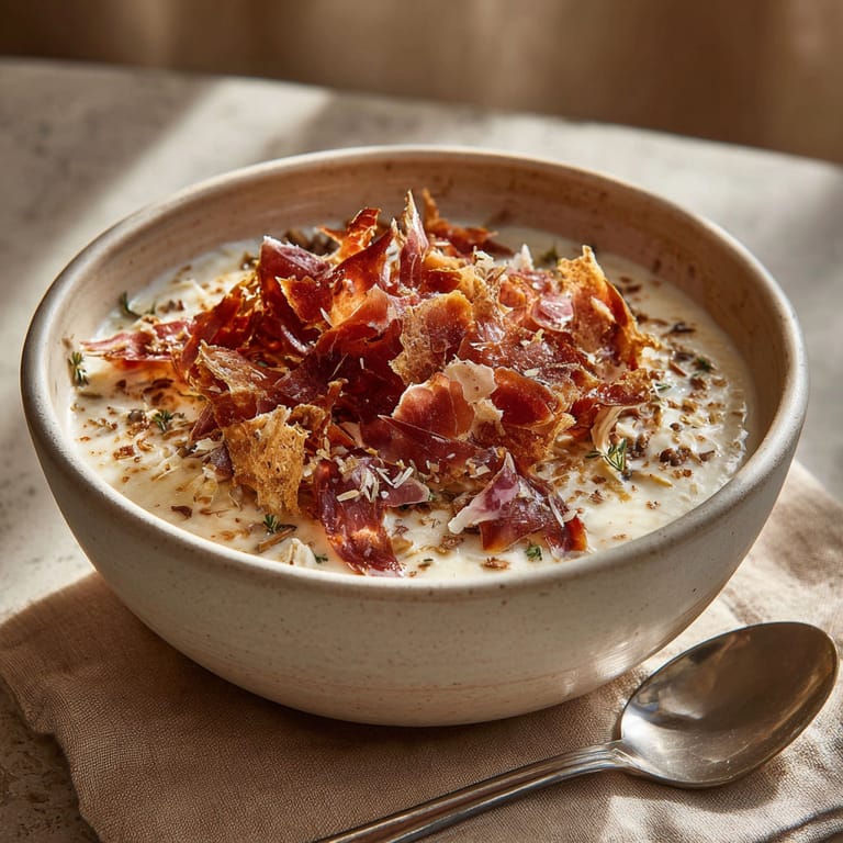 Guardar Esta receta es ideal para quienes buscan una crema reconfortante y sofisticada, perfecta para días frescos o una cena especial. Aquí te muestro cómo lograr esa textura aterciopelada y ese contraste de sabores entre la dulzura de la castaña, el sabor profundo de los champiñones y el toque crocante del jamón.