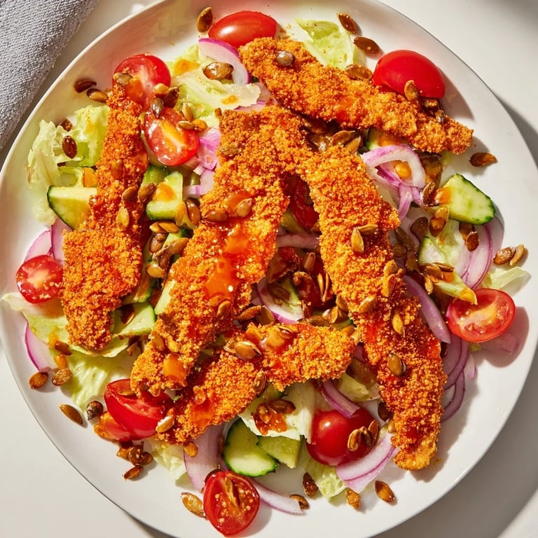 Riega la ensalada con la vinagreta y mezcla bien. Cubre con las tiras de pollo crujiente recién preparadas, baña generosamente con miel picante tibia y espolvorea semillas tostadas por encima. Sirve inmediatamente mientras el pollo mantiene su crujido irresistible.