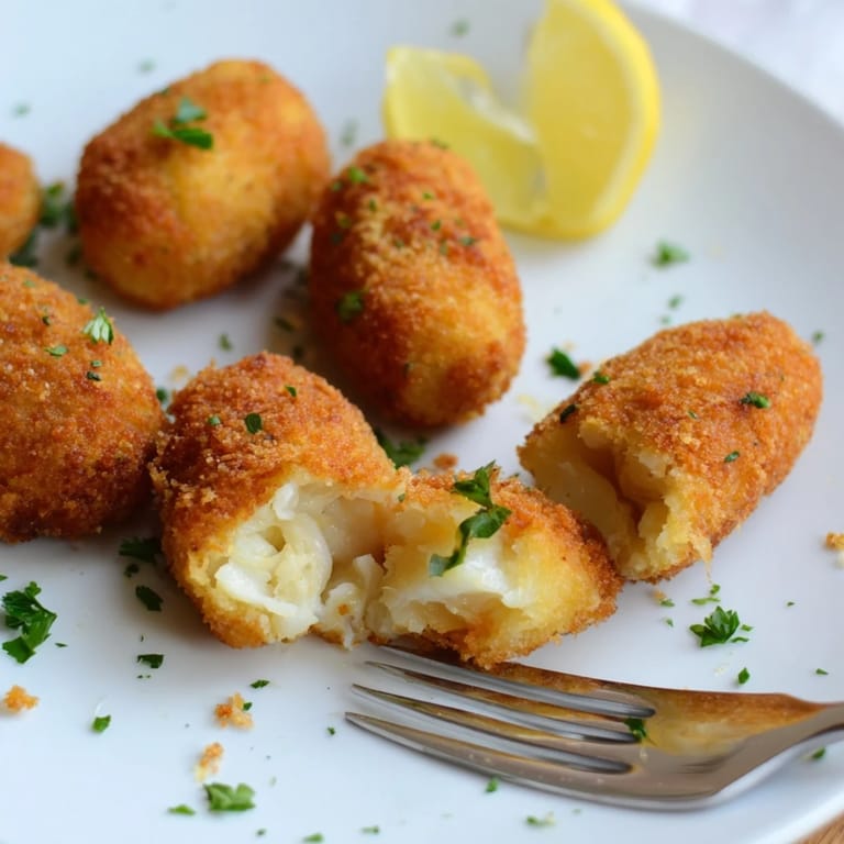 Guardar Croquetas crujientes de bacalao doradas y llenas de bacalao tierno y escamoso junto con cremosas patatas, perfectas como aperitivo o comida ligera.