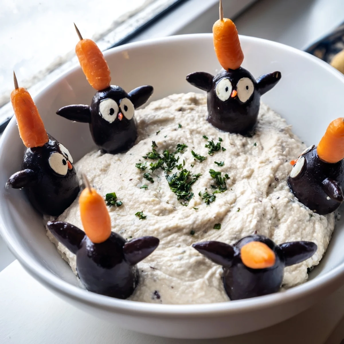 Guardar Un dip cremoso y sabroso de frijoles blancos perfecto para reuniones invernales, adornado con adorables decoraciones de pingüinos de aceituna para un toque festivo.