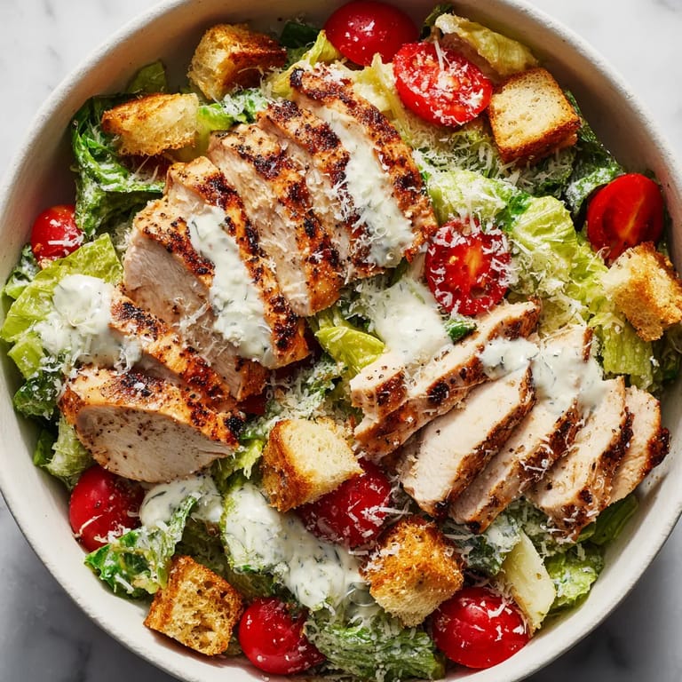 Guardar Esta ensalada César con pollo a la parrilla siempre me salva cuando quiero una comida ligera pero llena de sabor y textura al mismo tiempo. El pollo jugoso y dorado, la lechuga romana crujiente y el aderezo cremoso hacen de este plato una opción versátil y deliciosa tanto para el almuerzo como para una cena sencilla.