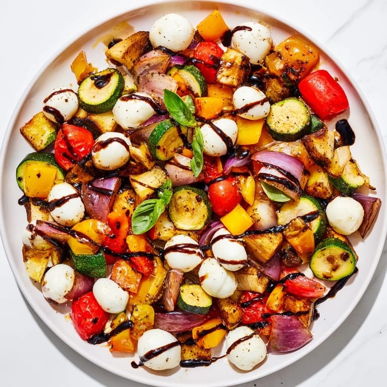 Guardar Descubrí esta ensalada un domingo soleado cuando decidí que las verduras asadas merecían más que un simple lado aburrido. Estaba buscando algo que capturara esa sensación de verano italiano, pero con un giro que me sorprendiera a mí misma. Cuando saqué la bandeja del horno y vi esos vegetales caramelizados brillando, supe que algo mágico había ocurrido. La idea de combinarlos con mozzarella tibia y un chorrito de bálsamo fue casi accidental, pero cuando lo probé por primera vez, entendí por qué algunas comidas simplemente funcionan.