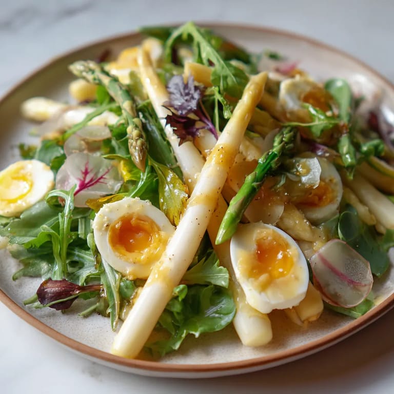 Guardar Esta ensalada de espárragos blancos primaveral es una opción delicada y elegante que resalta los tiernos espárragos blancos, hojas verdes crujientes y un aliño ligero, perfecta para reuniones de primavera o como un refinado entrante.