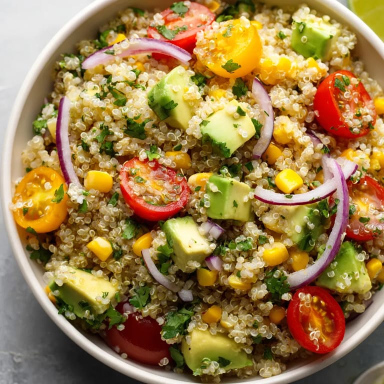 Guardar Una ensalada de quinoa refrescante y vibrante es mi solución preferida cuando los días calurosos exigen comida ligera y sabrosa. Esta receta combina granos esponjosos de quinoa con aguacate cremoso, maíz dulce, tomates jugosos y una vinagreta cítrica que aporta el toque final. Es perfecta como plato principal o acompañamiento en almuerzos veraniegos.