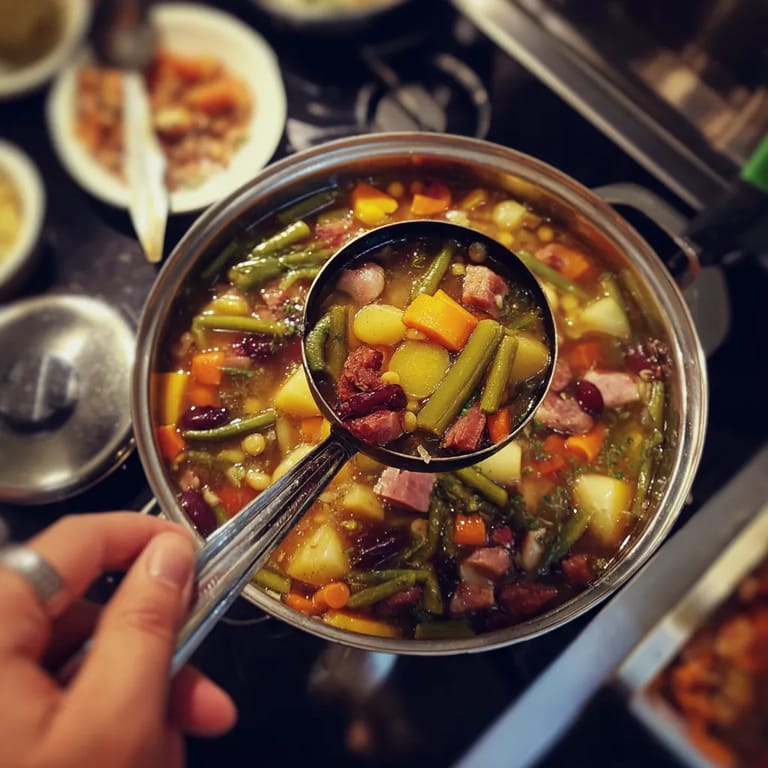 Guardar Esta escudella casera ha sido un plato esencial en la tradición catalana durante generaciones, combinando carnes, legumbres y verduras en un caldo reconfortante que resulta perfecto para compartir en familia.