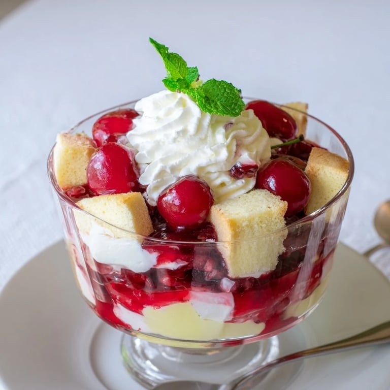 Un trifle de flan de cereza detallado con capas de pastel y crema. | yumyta.com