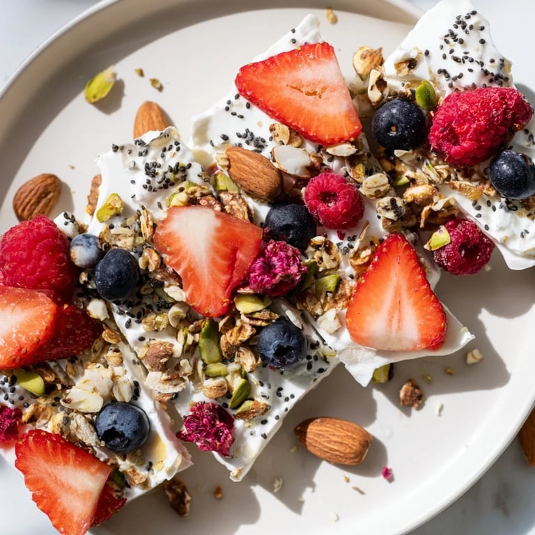 Este frozen yogurt bark combina la suavidad del yogurt griego con la frescura de frutas del bosque, creando un snack saludable y refrescante. La mezcla se extiende en una capa fina, se decora con granola y semillas, y se congela hasta obtener una textura firme y crocante. Perfecto para llevar al desayuno o como un dulce ligero en cualquier momento. Se puede adaptar con frutas y toppings al gusto, incluyendo opciones veganas con yogures vegetales.