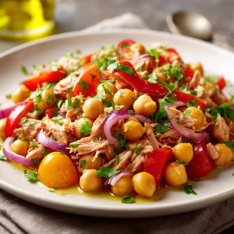 Puedes cambiar el atún por pollo desmenuzado o incluso dejarlo vegetariano omitiendo el pescado y añadiendo queso feta el pimiento rojo es reemplazable por amarillo o verde y el perejil puede sustituirse por cilantro fresco para un perfil diferente de sabor si usas garbanzos cocidos en casa recuerda cocinarlos bien hasta que estén tiernos pero no deshechos.