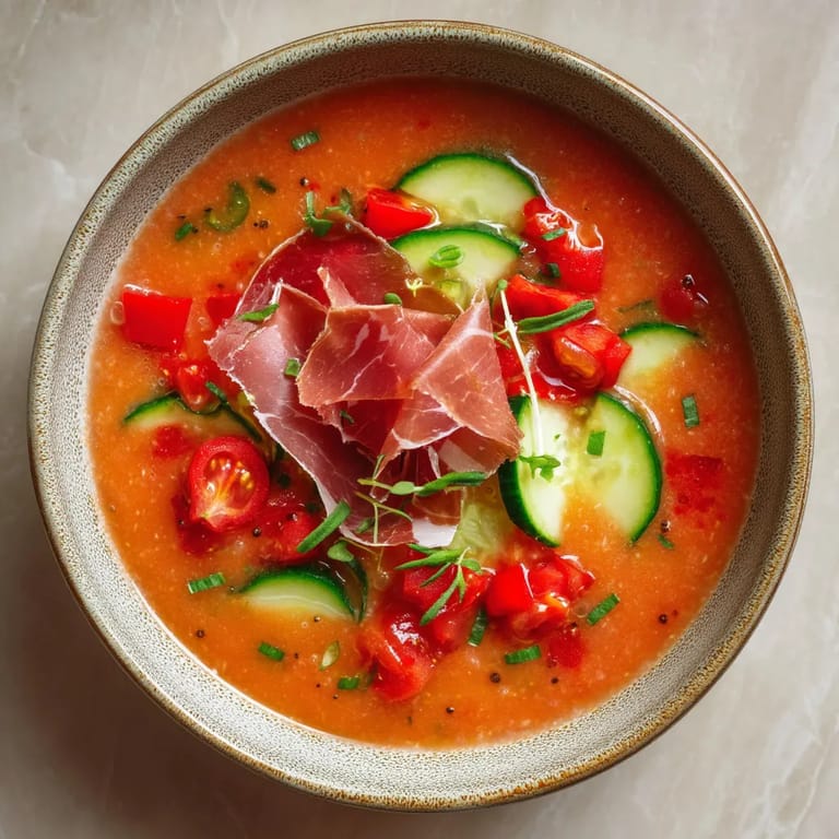 El gazpacho es una sopa fría tradicional del sur de España las versiones con fruta se han popularizado en las últimas décadas por su frescura y originalidad la inclusión del jamón serrano homenajea los sabores inconfundibles de la península ibérica