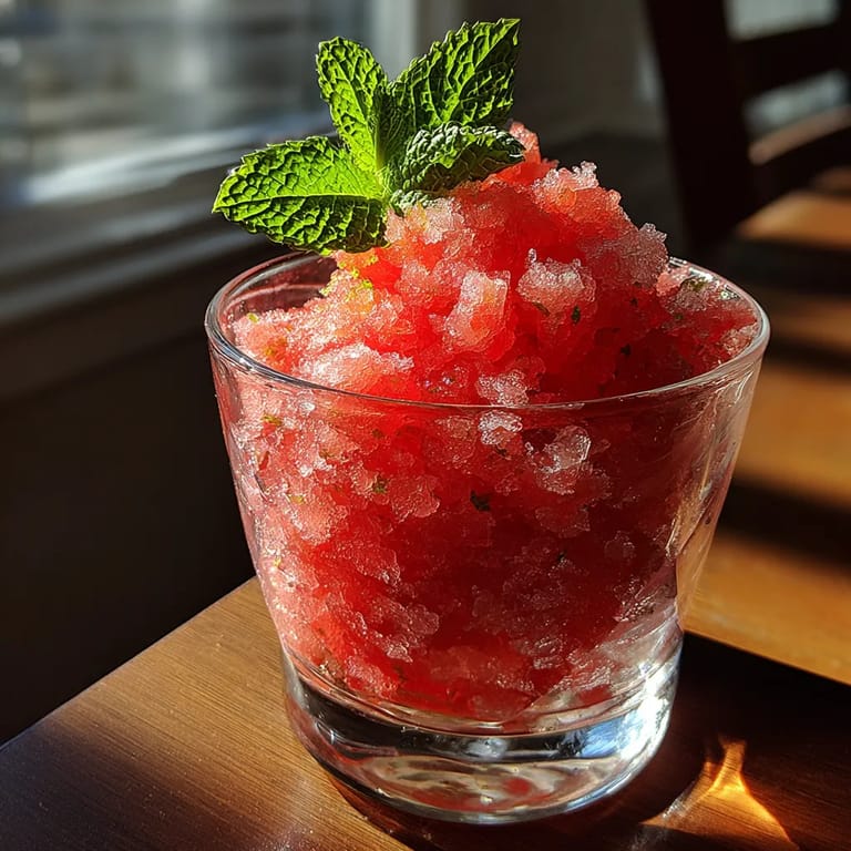 Guardar Nada dice verano como este granizado de sandía y menta servido bien frío directo del congelador. Es ideal cuando quieres un postre ultra ligero y refrescante que además se puede dejar preparado con antelación. La combinación de sandía jugosa y la menta fresca hacen de cada cucharada una pausa perfecta para los días de calor.