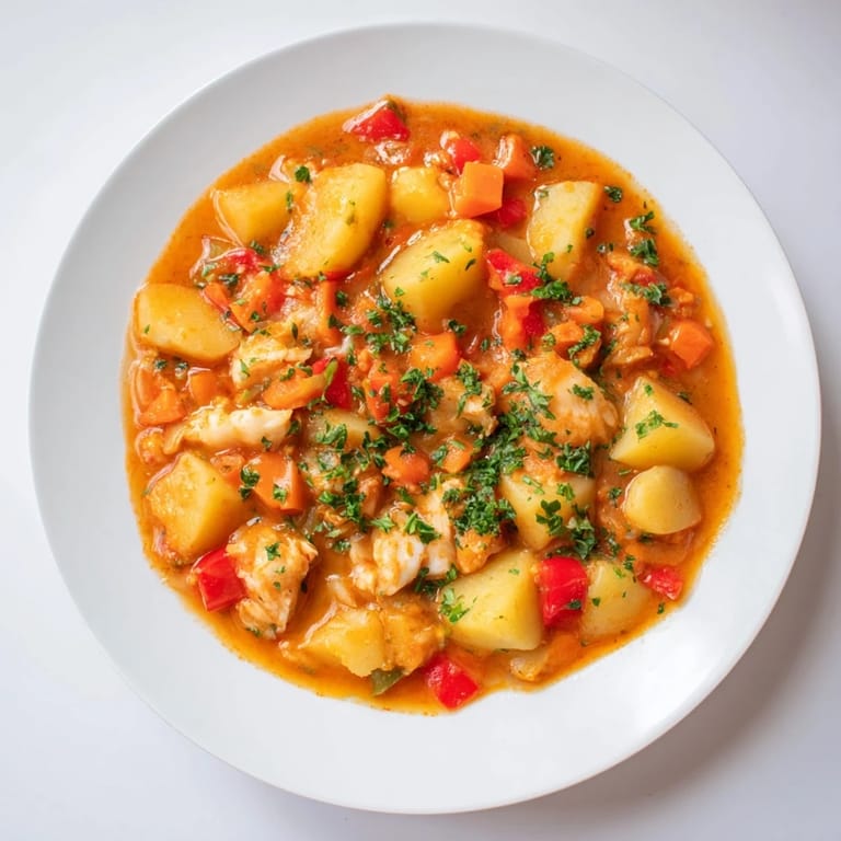 Guardar Estofado sustancioso y rústico con tiernas papas y bacalao desmenuzable cocinado junto en un fragante caldo de tomate. Este plato en una sola olla lleva el confort del marisco asequible a tu mesa con mínima complicación.