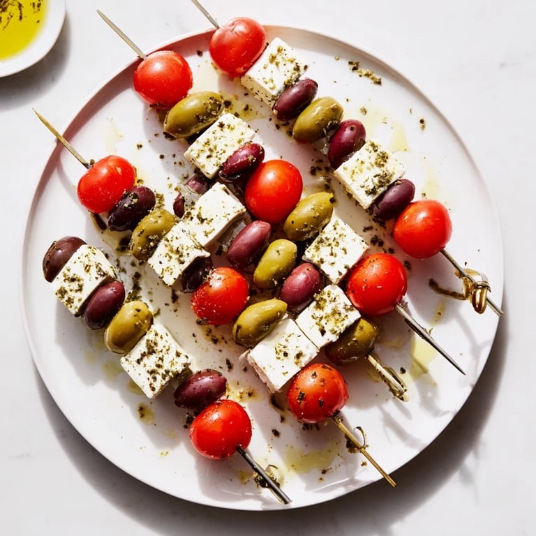 Mediterranean Holiday Cheers Olive and Feta Skewers: Close-up of flavorful skewers featuring feta, olives, and tomatoes, drizzled with olive oil, ideal for serving. Guardar