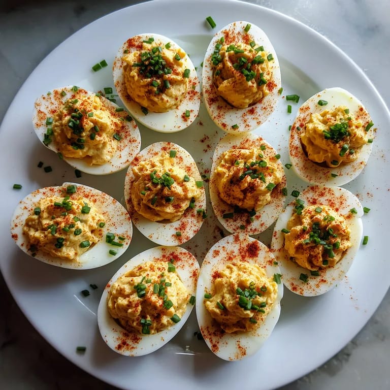 Guardar Estos huevos rellenos cremosos con el toque justo de mostaza y vinagre siempre triunfan en reuniones familiares o picnics. El contraste entre la yema suave y especiada y la clara fresca es irresistible. Son fáciles y rápidos de preparar con ingredientes comunes y sorprenden por su sabor clásico y su presentación vistosa.
