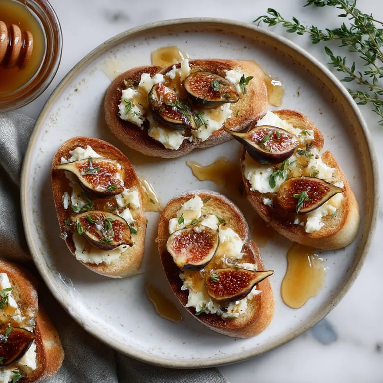 - Para elevar el sabor, drizzlea una pequeña cantidad de miel sobre cada crostini si lo deseas. Espolvorea unas pocas hojas de tomillo fresco arrancadas directamente del tallo y finaliza con una pizca de sal marina en escamas. La sal realza todos los sabores y crea un contraste maravilloso con la dulzura de los higos.