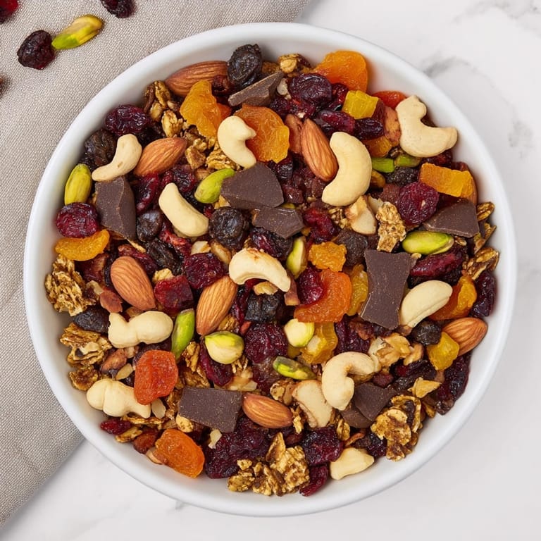 Guardar Mezcla para snack de aventura en la montaña, abundante y energizante, llena de frutos secos crujientes, frutas deshidratadas y un toque de chocolate perfecto para alimentar las aventuras al aire libre.