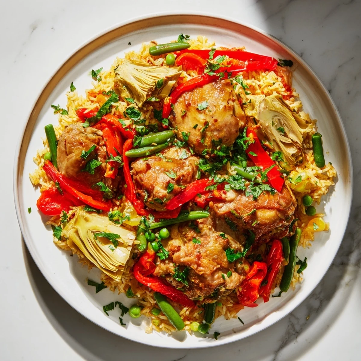 Guardar La auténtica paella con pollo y alcachofas es una delicia clásica al estilo valenciano, creada para obtener el máximo de sabor tradicional sin exceder el presupuesto. El arroz absorbe cada matiz de los ingredientes frescos y especias, convirtiendo esta receta en una opción ideal para compartir.