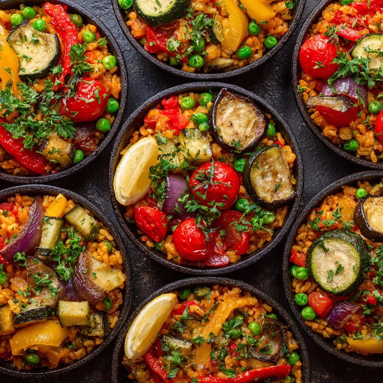 Guardar Estas mini paellas de verduras al horno son la solución perfecta cuando quieres impresionar con una comida colorida y llena de sabor sin complicarte la vida. Son ideales para reuniones porque permiten servir porciones elegantes que lucen como obra de arte en la mesa pero la preparación es sencilla y el resultado tiene todos los aromas de la cocina española en versión ligera y vegetariana.