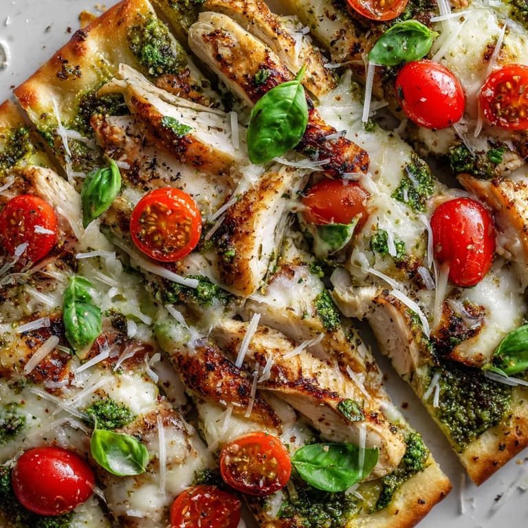 Guardar Esta flatbread de pollo a la parrilla con pesto es el tipo de receta que nos ha salvado mil cenas ocupadas. Combina la base crujiente del pan, la profundidad aromática del pesto casero y ese toque jugoso del pollo grillado. Sale lista en media hora y es la favorita hasta de quienes pensaban que el pollo era aburrido.