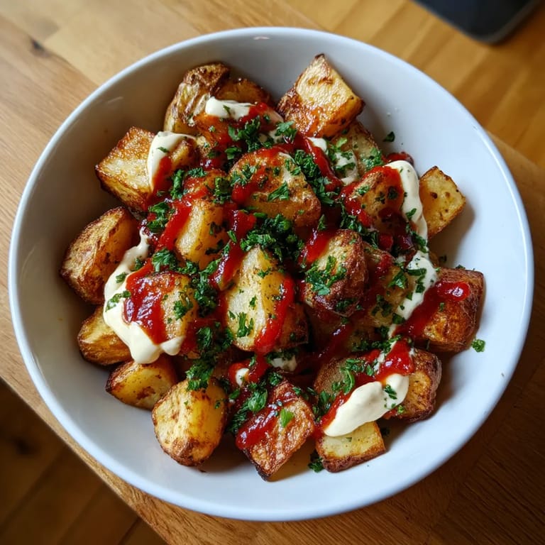 Guardar Las patatas bravas hechas en la freidora de aire son mi solución favorita para llevar el sabor clásico de los bares españoles directamente a casa de una manera mucho más ligera y sencilla. Los cubos quedan increíblemente crujientes por fuera y suaves por dentro y la salsa brava ahumada combinada con el alioli casero logran el contraste perfecto. Este plato es ideal para una noche de tapas con amigos o simplemente para consentirme en casa con algo especial y rápido.