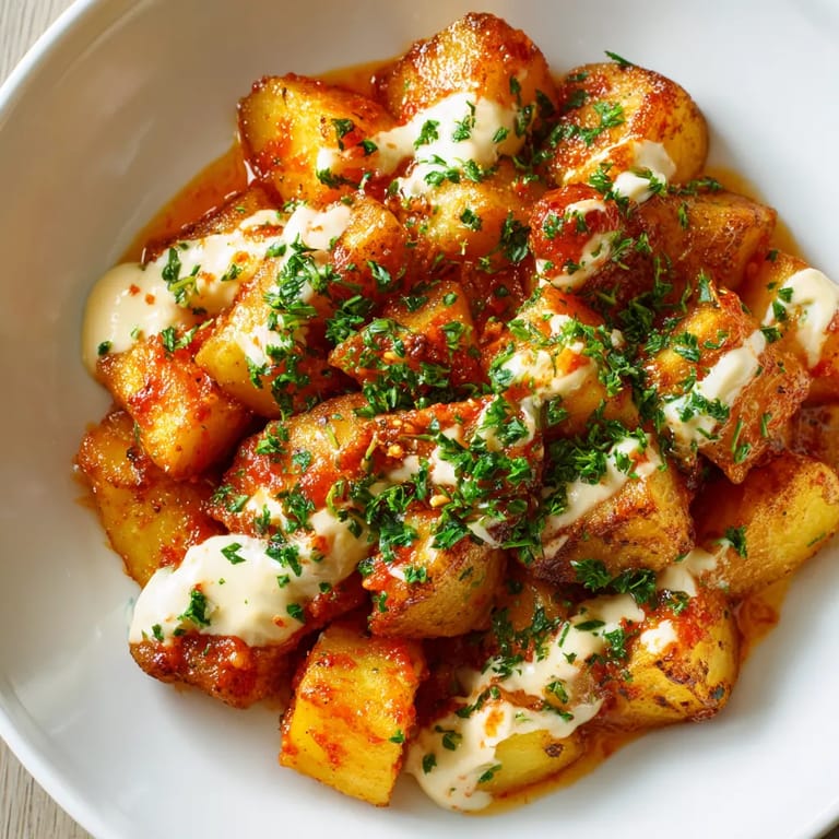 Guardar Las patatas bravas maison son la tapa perfecta cuando buscas algo sabroso y sencillo que guste a todos. Crujientes por fuera con una salsa brava casera llena de carácter ahumado, este plato español siempre triunfa durante los aperitivos o para acompañar carnes a la plancha. La clave está en el contraste entre las patatas doradas y la salsa picante que despierta recuerdos de veranos en terrazas madrileñas.