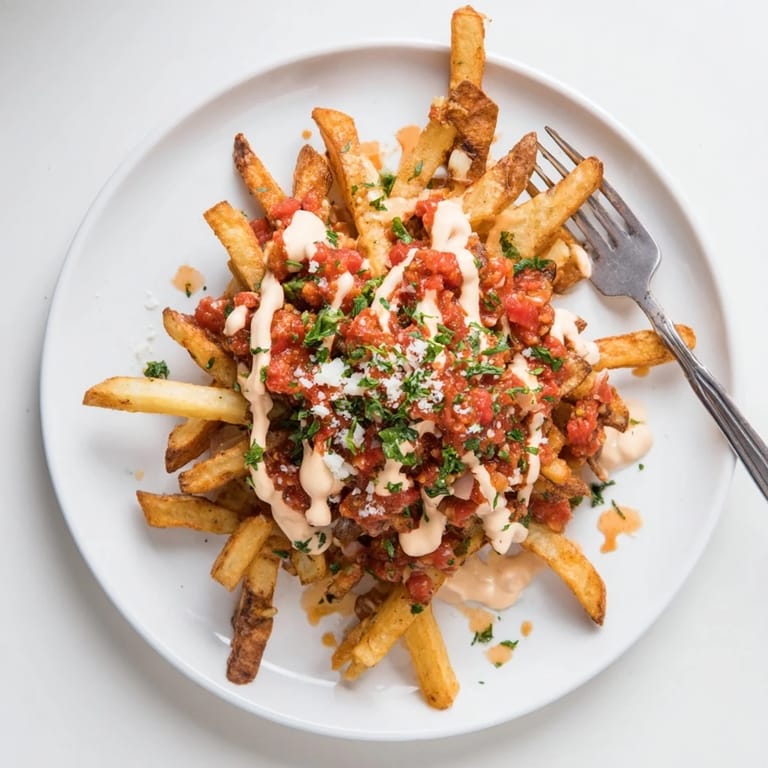 Guardar Papas fritas crujientes coronadas con salsa brava picante, alioli cremoso y hierbas frescas: una versión inspirada en la cocina española del clásico loaded fries.