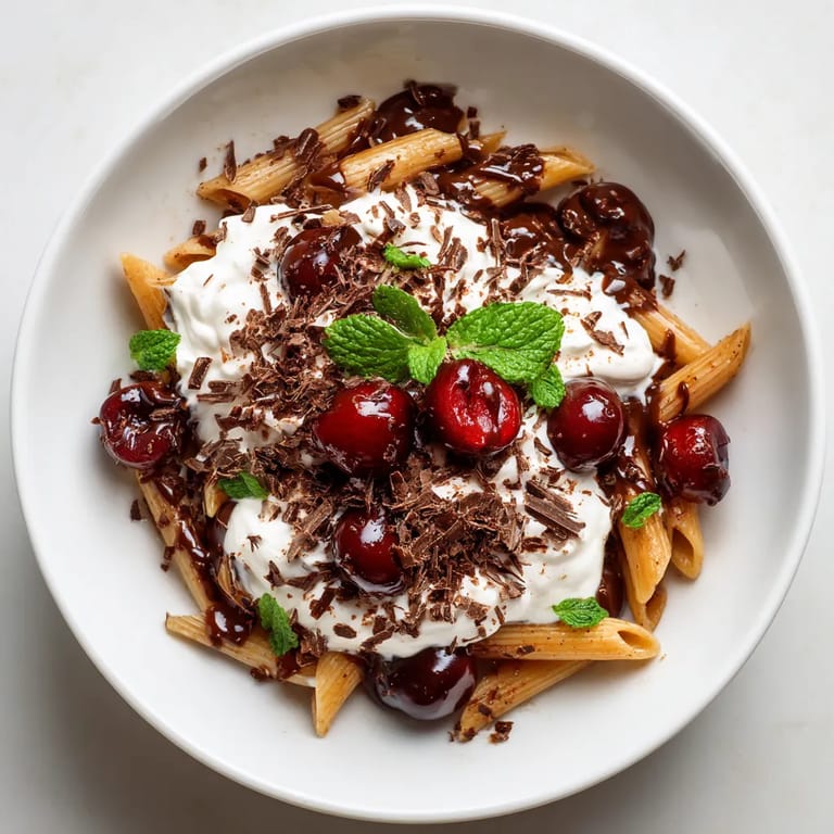 Guardar Esta pasta dulce es una versión divertida y elegante del clásico pastel Selva Negra usando penne cocido al dente, salsa de chocolate oscuro, cerezas jugosas y una nube de crema batida. Es ese postre que siempre causa sorpresa y sonrisas en la mesa, perfecto para ocasiones especiales o para transformar una tarde común en un recuerdo delicioso.