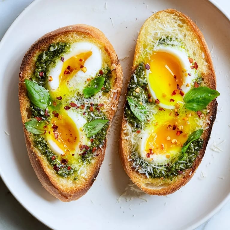 Guardar Una mañana, mientras esperaba que hirviera el agua para el café, noté que tenía huevos frescos y pan de masa fermentada en la despensa. Tomé un frasco de pesto casero que había hecho el fin de semana anterior y, en menos de veinte minutos, creé algo tan simple pero tan satisfactorio que se convirtió en mi desayuno de fin de semana favorito. La combinación de la yema cremosa, el pan tostado crujiente y el aroma herbáceo del pesto fue como descubrir que tres ingredientes comunes podrían transformarse en algo verdaderamente especial. Desde entonces, no puedo pasar una mañana sin pensar en esta tostada.