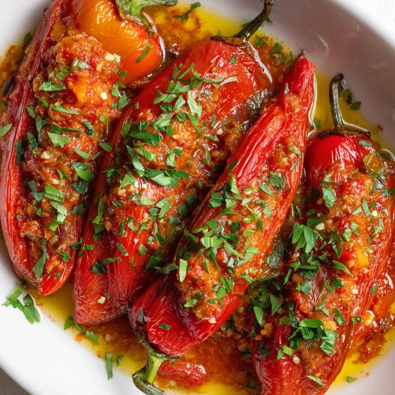 Guardar Estos pimientos del piquillo rellenos de un guiso sabroso de cerdo y sardina combinan la dulzura del pimiento con el potente sabor marino para lograr tapas vistosas y llenas de personalidad. Es una receta que fusiona tradición e innovación en la mesa siempre sorprende y siempre triunfa en reuniones familiares y con amigos