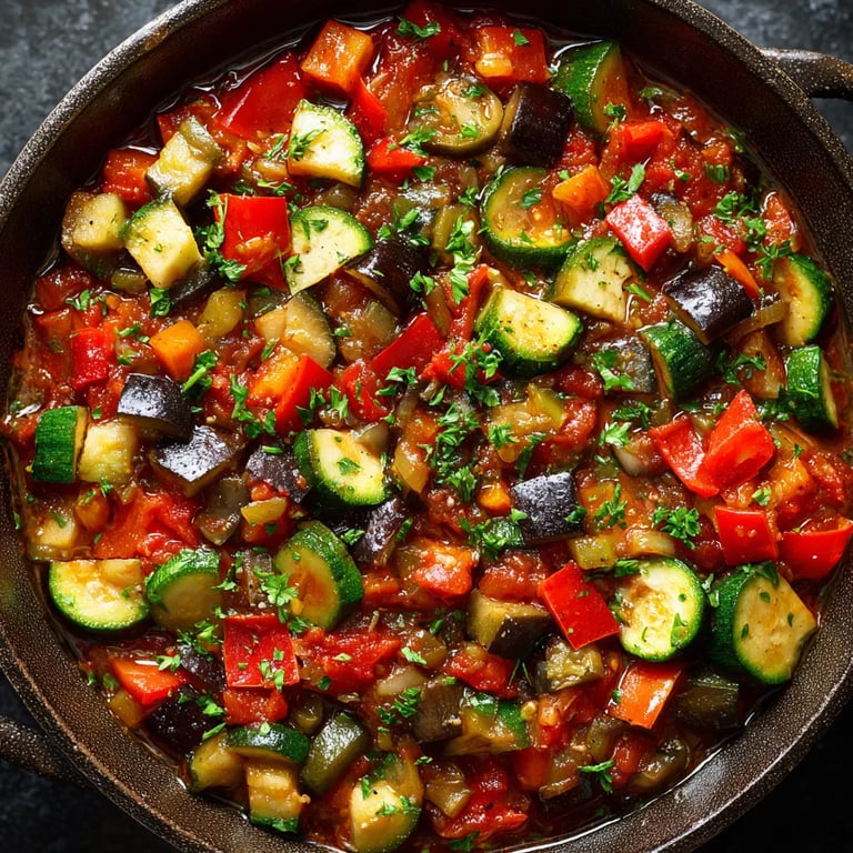 Guardar Este pisto andaluz simplificado es el plato perfecto cuando los mercados rebosan de tomates maduros, courgettes, aubergines et poivrons colorés. Inspirado par la tradition espagnole, il propose une manière savoureuse d’utiliser les produits de fin d’été en un seul ragoût végétarien facile qui se glisse aussi bien sur la table du déjeuner que du dîner. Chez moi, je le prépare avec de l’huile d’olive fruitée, de l’ail frais et un bon pain pour saucer jusqu’à la dernière goutte.