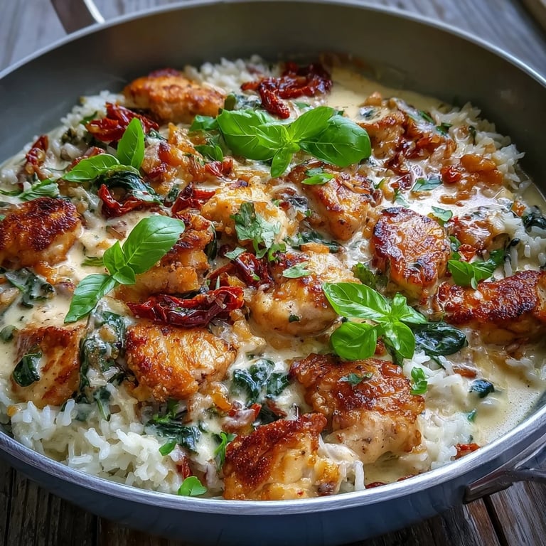 Guardar Bring the vibrant flavors of the Mediterranean to your table with this Creamy Tuscan Chicken Rice Skillet. This comforting one-pan meal features tender chicken, a luscious garlic-Parmesan sauce, and the perfect combination of sun-dried tomatoes and fresh spinach. In just 45 minutes, you can create a restaurant-quality dish that serves four and offers a homestyle fusion of Italian-American comfort.