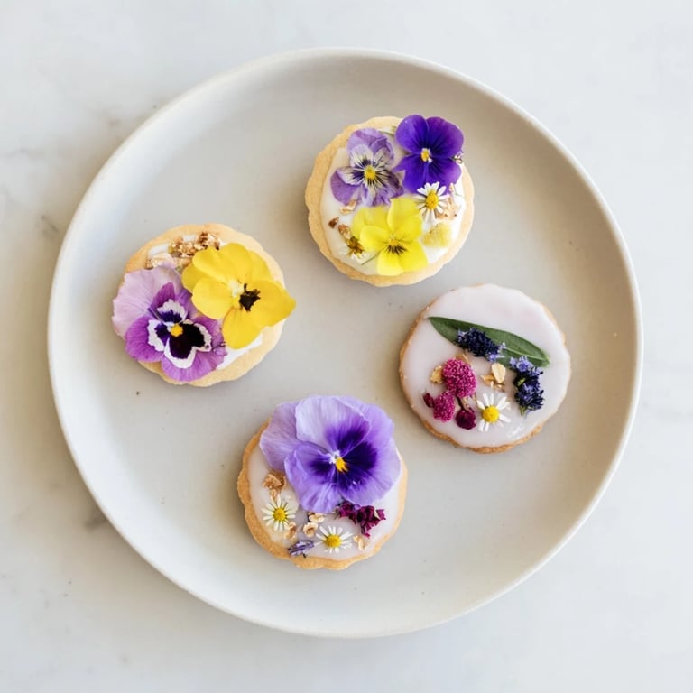 Preparar las galletas de mantequilla con flores: Precaliente el horno a 350°F (175°C). Forre una bandeja para hornear con papel pergamino. Bata la mantequilla con el azúcar glas hasta obtener una mezcla ligera y esponjosa. Incorpore la vainilla. Tamice la harina y la sal, luego mezcle hasta formar una masa. Extienda la masa a un grosor de 1/4 de pulgada y corte en la forma deseada. Presione suavemente las flores comestibles sobre las galletas. Hornee de 10 a 12 minutos o hasta que los bordes estén ligeramente dorados. Deje enfriar completamente.