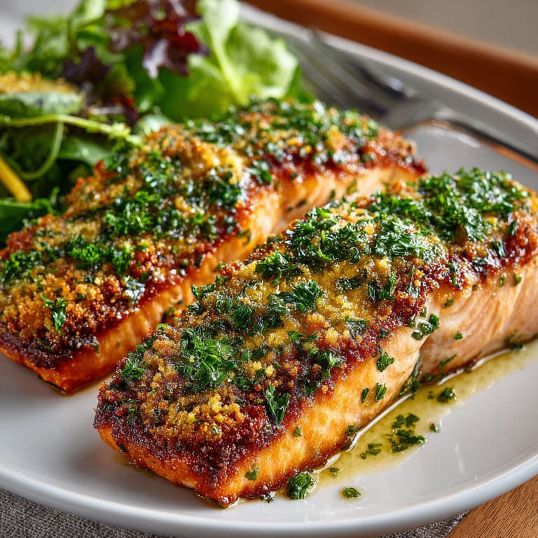 Guardar Este salmón al horno con costra de hierbas mediterráneas y cítricos es una forma deliciosa y elegante de disfrutar un plato principal saludable y lleno de matices. Tiene una textura crujiente por fuera, jugoso por dentro, y aromas frescos que lo hacen perfecto tanto para una comida diaria como para ocasiones más especiales.