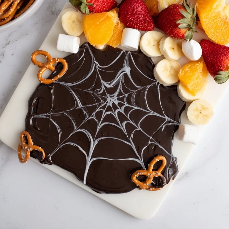 Guardar Un postre impactante de Halloween que presenta una rica ganache de chocolate decorada artísticamente con una telaraña de chocolate blanco, servida con una variedad de bocados para sumergir.