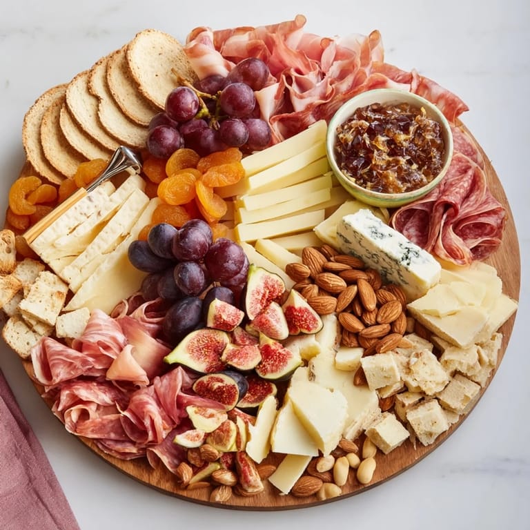 Guardar Una tabla de charcutería elegante y fácil de preparar perfecta para reuniones grandes o para una ocasión especial. Incluye carnes artesanales, quesos variados, frutas frescas y secas, además de un original fudge de soda de higo casero que aporta un toque dulce único.
