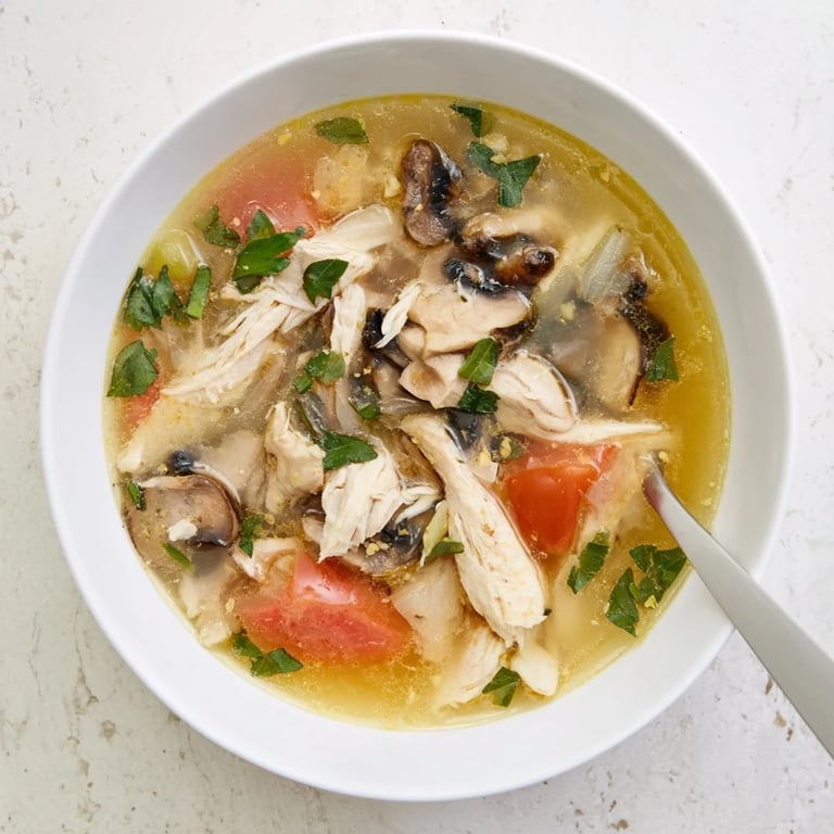 Colorful serving of Tom Yum Gai, showcasing vibrant red tomatoes and earthy mushrooms in the fragrant broth. Guardar