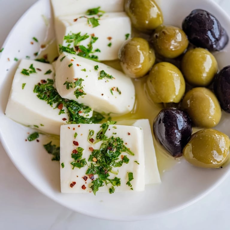 La presentación es donde esta receta realmente brilla. Usa una tabla de corcho o madera que contraste con los colores vivos de las aceitunas y quesos. Los colores importan: las aceitunas negras junto a las verdes, luego el blanco cremoso del queso. Agrupa los artículos en pequeños clusters en lugar de dispersarlos uniformemente; esto hace que todo se vea intencionado. La miel debe estar en su propio cuenco pequeño y hermoso, algo que invite a las personas a scobar con el pan de pita.
