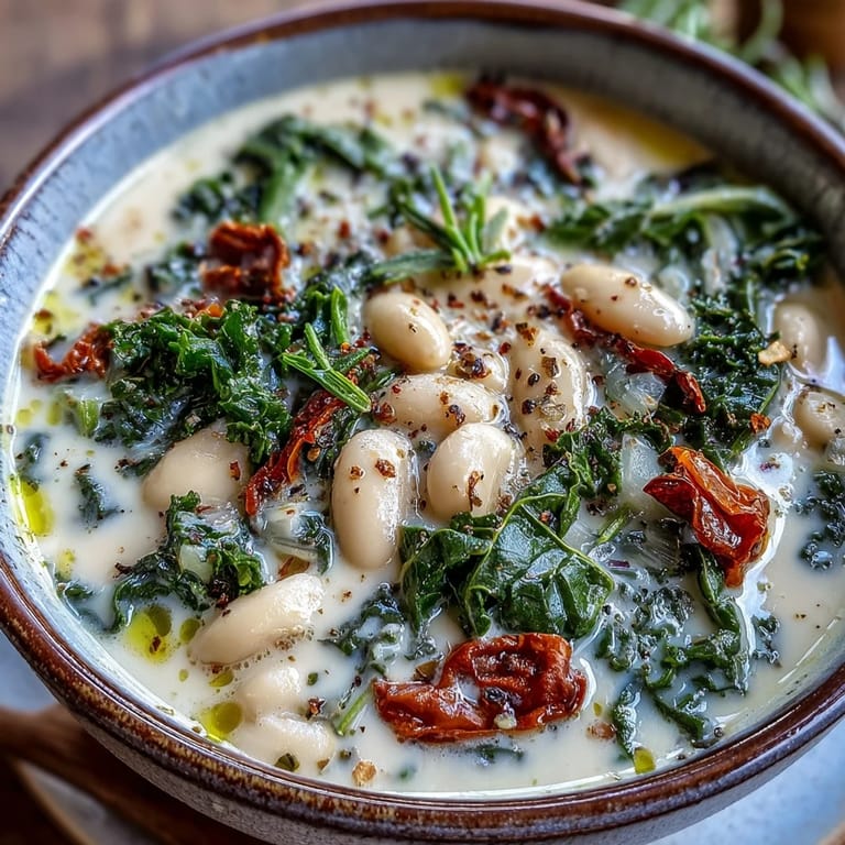 Guardar There's something about the first cool evening of autumn that makes me crave soup, and this Tuscan white bean and kale creation has become my go-to. I discovered it while flipping through an old Italian cookbook at a farmer's market, drawn to the promise of cashew cream replacing the traditional panna cotta. The combination of silky beans, earthy kale, and sun-dried tomatoes felt like a warm hug in a bowl, and when I finally made it, my kitchen filled with garlic and herb-infused steam that had my partner asking what magical thing I was cooking.