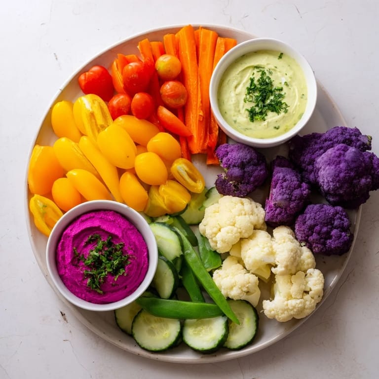 - Lavar y preparar todas las verduras. Colocar en secciones sobre una bandeja grande creando un efecto arcoíris con los diferentes colores.