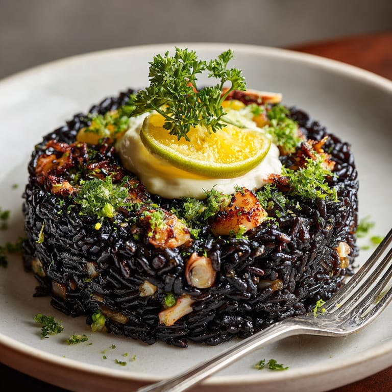 Guardar El arroz negro con sepia y alioli de lima es una deliciosa muestra de la cocina mediterránea, perfecta para sorprender en reuniones familiares o con amigos. Su intenso color y aromas cautivan desde el primer momento y el alioli cítrico añade un matiz refrescante y original.
