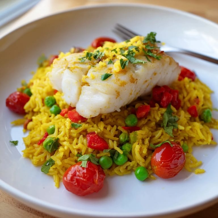 Guardar Un plato vibrante y aromático preparado en una sola sartén que presenta filetes de bacalao tiernos sobre arroz dorado con azafrán, tomates y guisantes. Ideal para una cena mediterránea deliciosa y reconfortante entre semana.